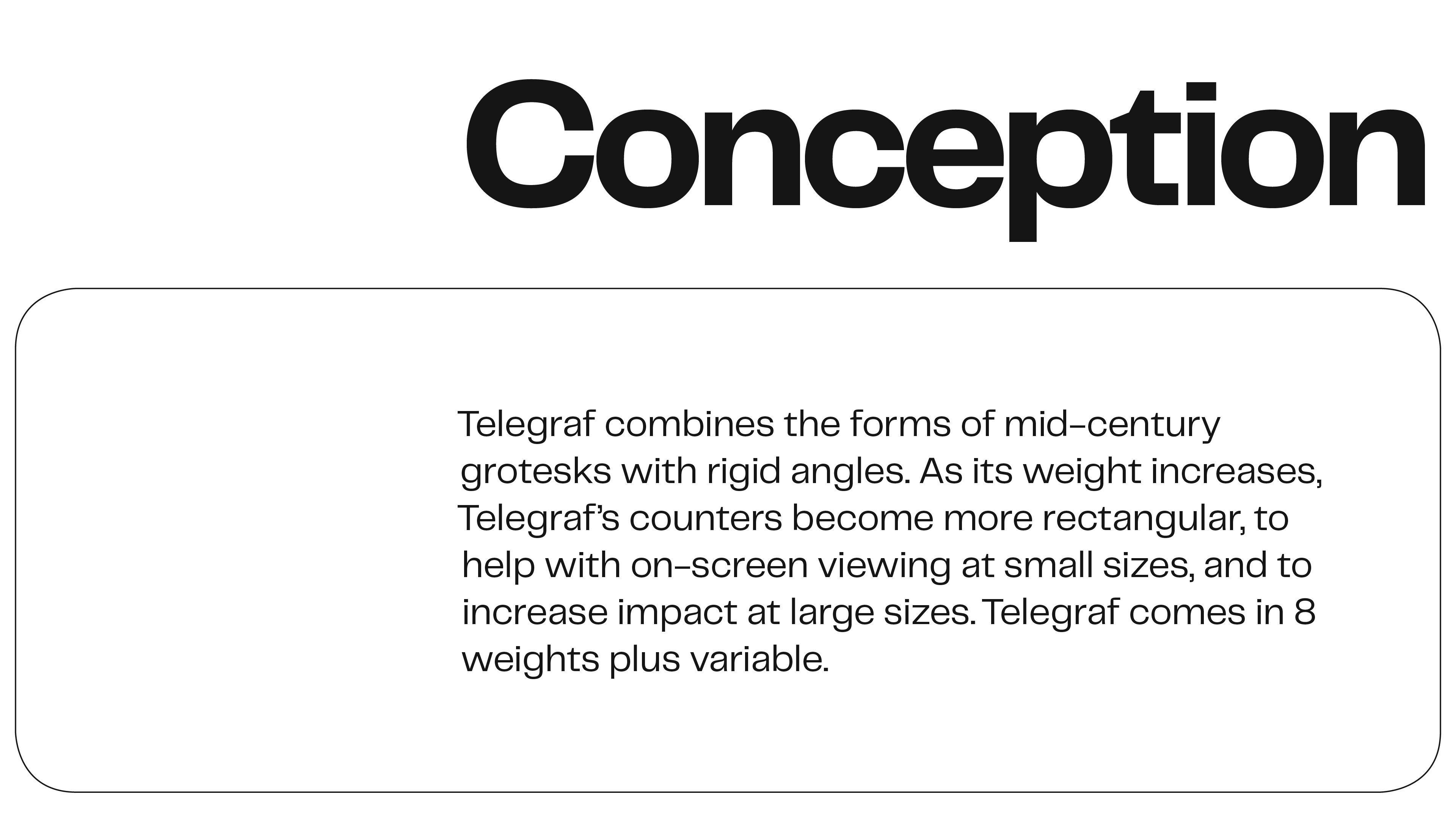 Telegraf combines the forms of mid-century grotesks with rigid angles. As its weight increases, Telegraf’s counters become more rectangular, to help with on-screen viewing at small sizes, and to increase impact at large sizes.